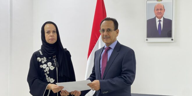 تسلم السفير جمال عوض، مستشار وزير الخارجية لشؤون الديوان العام، اليوم في العاصمة المؤقتة عدن، أوراق اعتماد رئيسة بعثة اللجنة الدولية للصليب الأحمر لدى اليمن، السيدة كرستين شيبولا.