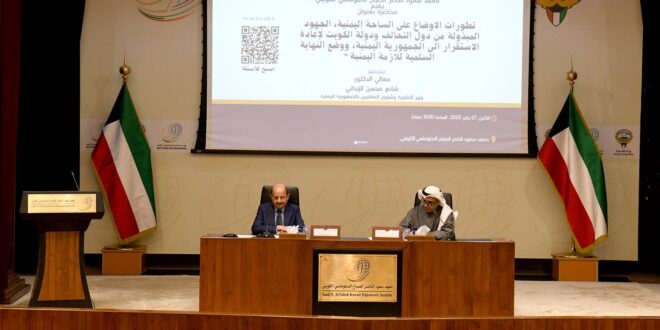 واشار معالي الوزير الزنداني خلال محاضرة القاها، اليوم، في معهد سعود الناصر الصباح الدبلوماسي الكويتي، بحضور نائب وزير الخارجية الكويتي، الشيخ جراح جابر الأحمد الصباح، ومساعد وزير الخارجية لشؤون معهد سعود ناصر الصباح الدبلوماسي الكويتي، السفير ناصر الصبيح، وعدد من الدبلوماسيين الكويتيين، والسفراء واعضاء السلك الدبلوماسي المعتمدين لدى الكويت، الى مواقف الحكومة اليمنية وتجاوبها مع كافة الجهود الإقليمية والدولية الهادفة إلى انهاء الحرب وتحقيق السلام وفقاً للمرجعيات المقرة وفي مقدمتها قرار مجلس الامن رقم ٢٢١٦، والقرارات ذات الصلة.. مشيراً الى الملابسات التي أدت إلى توقيع اتفاق استوكهولم والذي بسببه لم يتم تحرير ميناء الحديدة من قبضة المليشيات الحوثية.