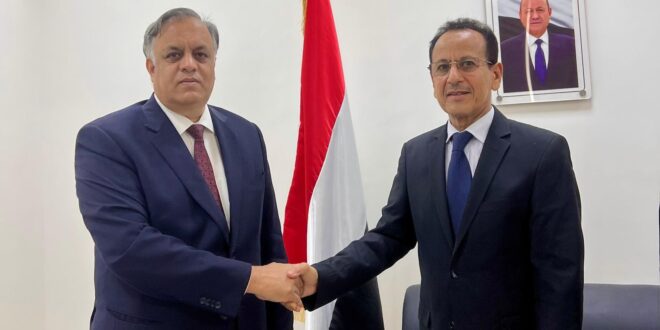 The Advisor to the Minister of Foreign Affairs and Expatriates Ambassador Jamal Awadh discussed today, Sunday, in the transitional capital Aden, with the Indian Ambassador to the Republic of Yemen Dr. Suhel Ajaz Khan bilateral relations and cooperation between the two countries.