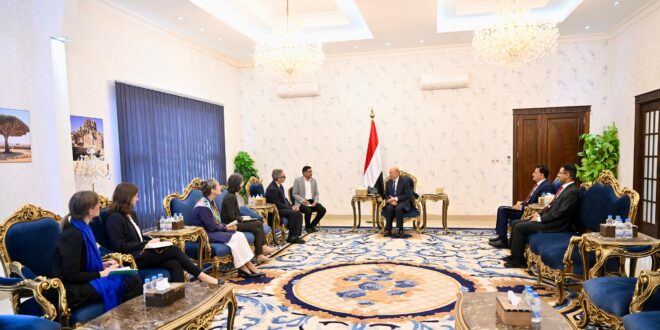 Chairman of the Presidential Leadership Council, Dr. Rashad al-Alimi, met with European ambassadors in Aden, urging the international community to take a stronger stance against the Houthi militia’s terrorist threats.