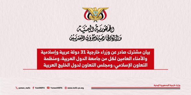 أدان وزراء خارجية كل من الجمهورية اليمنية والجمهورية الجزائرية الديمقراطية الشعبية، ومملكة البحرين، وجمهورية بنجلادش الشعبية، وجمهورية تشاد، وجمهورية القُمر المتحدة، وجمهورية جيبوتي، وجمهورية مصر العربية، وجمهورية جامبيا، وجمهورية إندونيسيا، وجمهورية العراق، والمملكة الأردنية الهاشمية، ودولة الكويت، والجمهورية اللبنانية، ودولة ليبيا، وجمهورية المالديف، والجمهورية الإسلامية الموريتانية، والمملكة المغربية، وجمهورية نيجيريا الاتحادية، وسلطنة عُمان، وجمهورية باكستان الإسلامية، ودولة فلسطين، ودولة قطر، والمملكة العربية السعودية، وجمهورية السنغال، وجمهورية سيراليون، وجمهورية الصومال الفيدرالية، وجمهورية السودان، والجمهورية العربية السورية، والجمهورية التركية، ودولة الإمارات العربية المتحدة، وأمين عام جامعة الدول العربية، وأمين عام منظمة التعاون الإسلامي، وأمين عام مجلس التعاون لدول الخليج العربية، بأشدّ العبارات التصريحات التي أدلى بها بنيامين نتنياهو رئيس وزراء إسرائيل (القوة القائمة بالاحتلال)، والتي نقلتها وسائل الإعلام الإسرائيلية بشأن ما يُسمى بـ “إسرائيل الكبرى”، والتي تمثّل استهانة بالغة وافتئاتًا صارخًا وخطيرًا لقواعد القانون الدولي، ولأسس العلاقات الدولية المستقرة، وتشكّل تهديدًا مباشرًا للأمن القومي العربي ولسيادة الدول، والأمن والسلم الإقليمي والدولي.