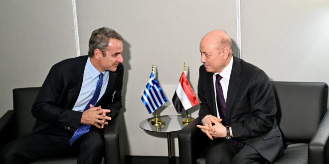 التقى فخامة الرئيس الدكتور رشاد محمد العليمي، رئيس مجلس القيادة الرئاسي اليوم الثلاثاء في نيويورك، ومعه عضوا المجلس اللواء عيدروس الزبيدي، والدكتور عبدالله العليمي، على هامش اجتماعات الجمعية العامة للأمم المتحدة، رئيس وزراء اليونان، كيرياكوس ميتسوتاكيس، للبحث في مستجدات الاوضاع المحلية والعلاقات الثنائية بين البلدين الصديقين، وفرص تعزيزها في مختلف المجالات.