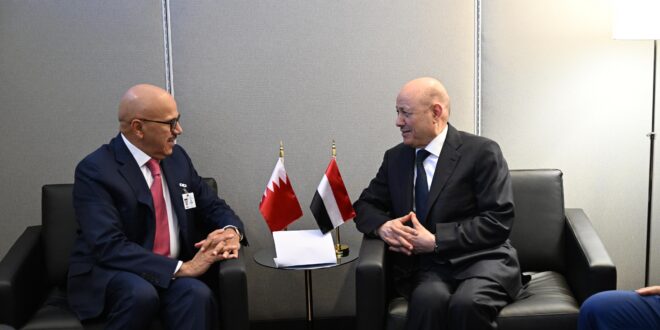 استقبل فخامة الرئيس الدكتور رشاد محمد العليمي، رئيس مجلس القيادة الرئاسي ومعه عضوا المجلس اللواء عيدروس الزبيدي، والدكتور عبدالله العليمي اليوم الاربعاء وزير خارجية مملكة البحرين، الدكتور عبداللطيف الزياني، وذلك على هامش أعمال الدورة الثمانين للجمعية العامة للأمم المتحدة في نيويورك.