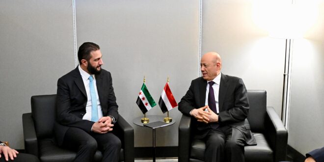 Chairman of the Presidential Leadership Council Dr. Rashad al-Alimi, along with Council members Major General Aidaroos al-Zubaidi and Dr. Abdullah al-Alimi, met Tuesday with President Ahmed Al-Sharaa of the Syrian Arab Republic on the sidelines of the United Nations General Assembly meetings.