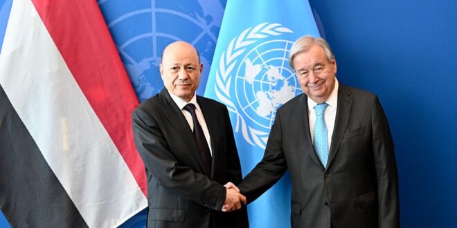 ووضع رئيس مجلس القيادة، امين عام الامم المتحدة امام تعقيدات الاوضاع الاقتصادية والانسانية التي فاقمتها هجمات المليشيات الحوثية الارهابية المدعومة من النظام الايراني على المنشآت النفطية، وسفن الشحن البحري.