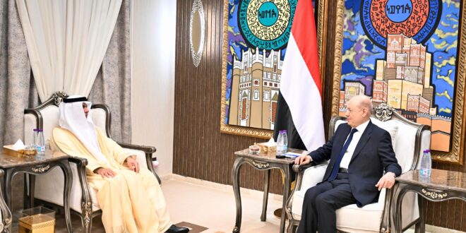 His Excellency President Dr. Rashad al-Alimi, Chairman of the Presidential Leadership Council (PLC) received today, Wednesday, the Ambassador of the United Arab Emirates (UAE) to the Republic of Yemen Mohammed al-Zaabi.