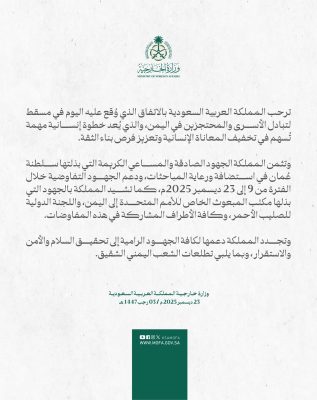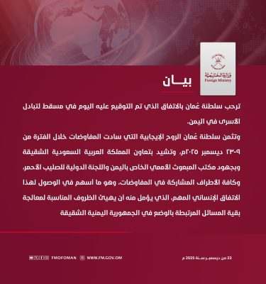 بيان ترحيب المملكة العربية السعودية وسلطنة عمان باتفاق تبادل الأسرى ديسمبر 23, 2025 الأخبار, اليمن, خبر عاجل شارك Facebook Twitter LinkedIn