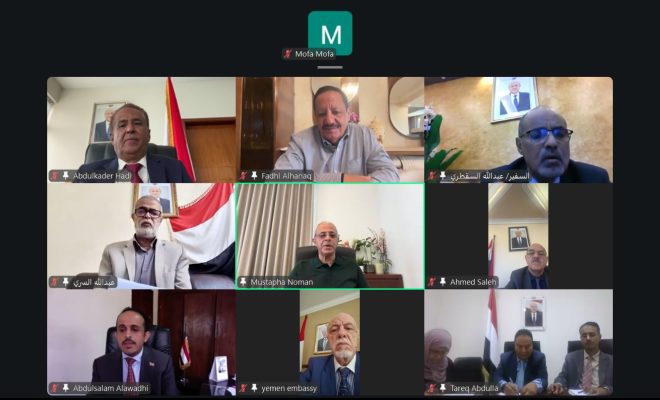 عقد نائب وزير الخارجية وشؤون المغتربين، مصطفى نعمان، اليوم، اجتماعاً موسعاً عبر تقنية الاتصال المرئي، مع رؤساء بعثات الجمهورية اليمنية لدى افريقيا.وناقش الاجتماع، الذي ضم سفراء ورؤساء بعثات اليمن لدى كُلاً من جيبوتي، والصومال، وتنزانيا، واثيوبيا، وارتيريا، وجنوب افريقيا، وكينيا، الوضع السياسي الراهن، والوضع المالي للبعثات في ظل تداعيات الحرب والاعتداءات الإيرانية على دول المنطقة.واستعرض رؤساء البعثات، تقارير شفهية حول مجريات الأحداث، ومواقف الدول إزاء الاحداث الراهنة، وقدموا عدداً من الملاحظات والتوصيات الكفيلة بتعزيز علاقات بلادنا مع الدول المعتمدين فيها.