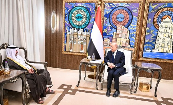 His Excellency President Dr. Rashad Mohammed al-Alimi, the Chairman of the Presidential Leadership Council, received Thursday the Ambassador of the State of Kuwait, Falah al-Hajraf on the occasion of the end of his tenure as ambassador of his brotherly country to the Republic of Yemen.