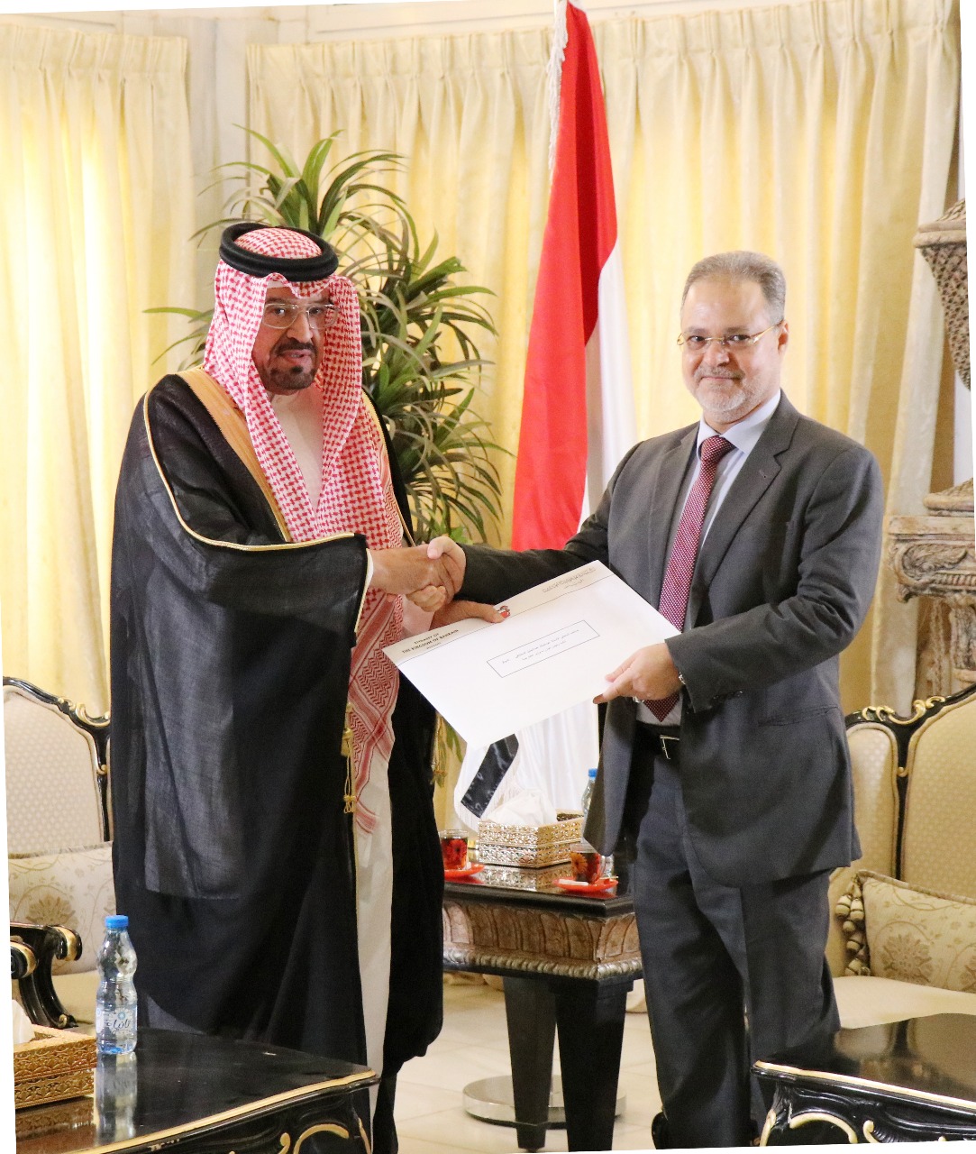 تسلم نائب رئيس الوزراء وزير الخارجية عبدالملك المخلافي اليوم نسخة من أوراق اعتماد سفير مملكة البحرين غير المقيم لدى اليمن حمود بن عبدالله آل خليفة.