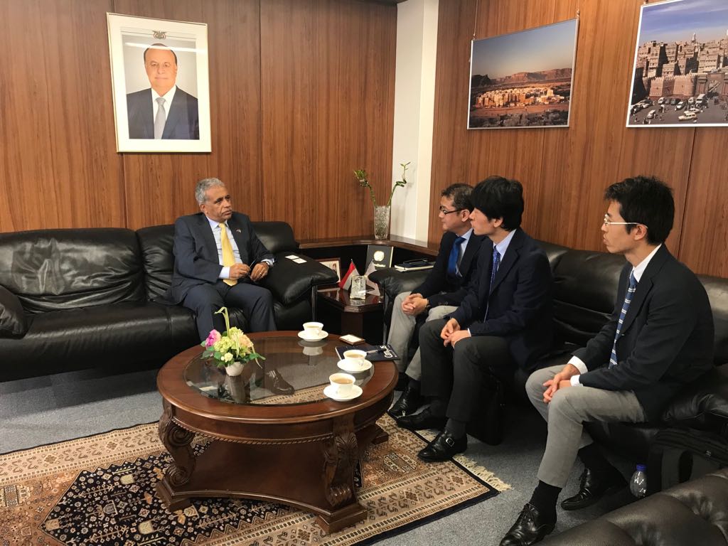 بحث سفير اليمن لدى طوكيو سمير محمد خميس اليوم مع المدير الاقليمي لمكتب وكالة التنمية اليابانية الجايكا اومورا يوشوفيمي والمدير المسئول عن شئون اليمن في الوكالة تاكيشيتا ماساكاتا امكانية استئناف تنفيذ بعض مشاريعها الموقفة في اليمن بسبب الحرب الدائرة ، وامكانية اعادة فتح مكتبها في العاصمة المؤقتة عدن وتطوير برامج التدريب التي تقدمها الوكالة لليمن.