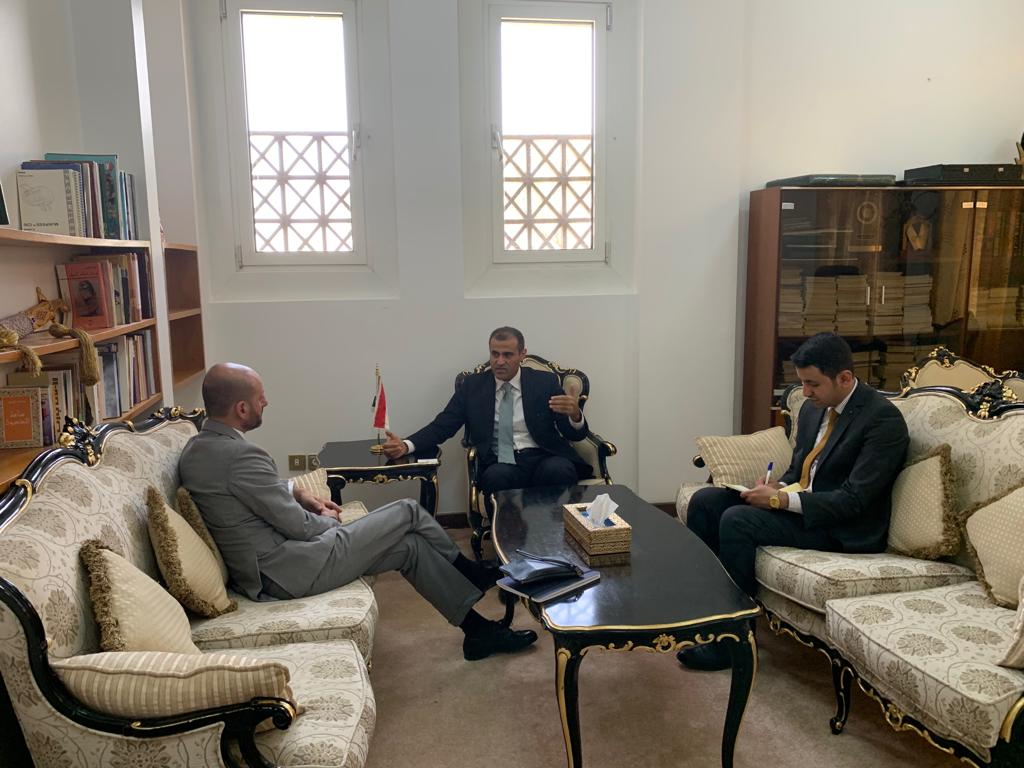 بحث نائب وزارة الخارجية محمد الحضرمي اليوم مع نائب رئيس بعثة الاتحاد الاوروبي لدى اليمن ريكاردو فيلا ، مستجدات الأوضاع على الساحة اليمنية.