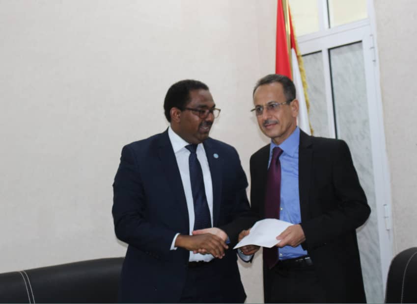 تسلم مستشار وزير الخارجية لشؤون الديوان العام السفير جمال عوض ناصر، اليوم، بالعاصمة المؤقتة عدن، أوراق اعتماد الممثل المقيم الجديد لمنظمة الأغذية والزراعة للأمم المتحدة “فاو” في الجمهورية اليمنية، الدكتور حسين جادين.