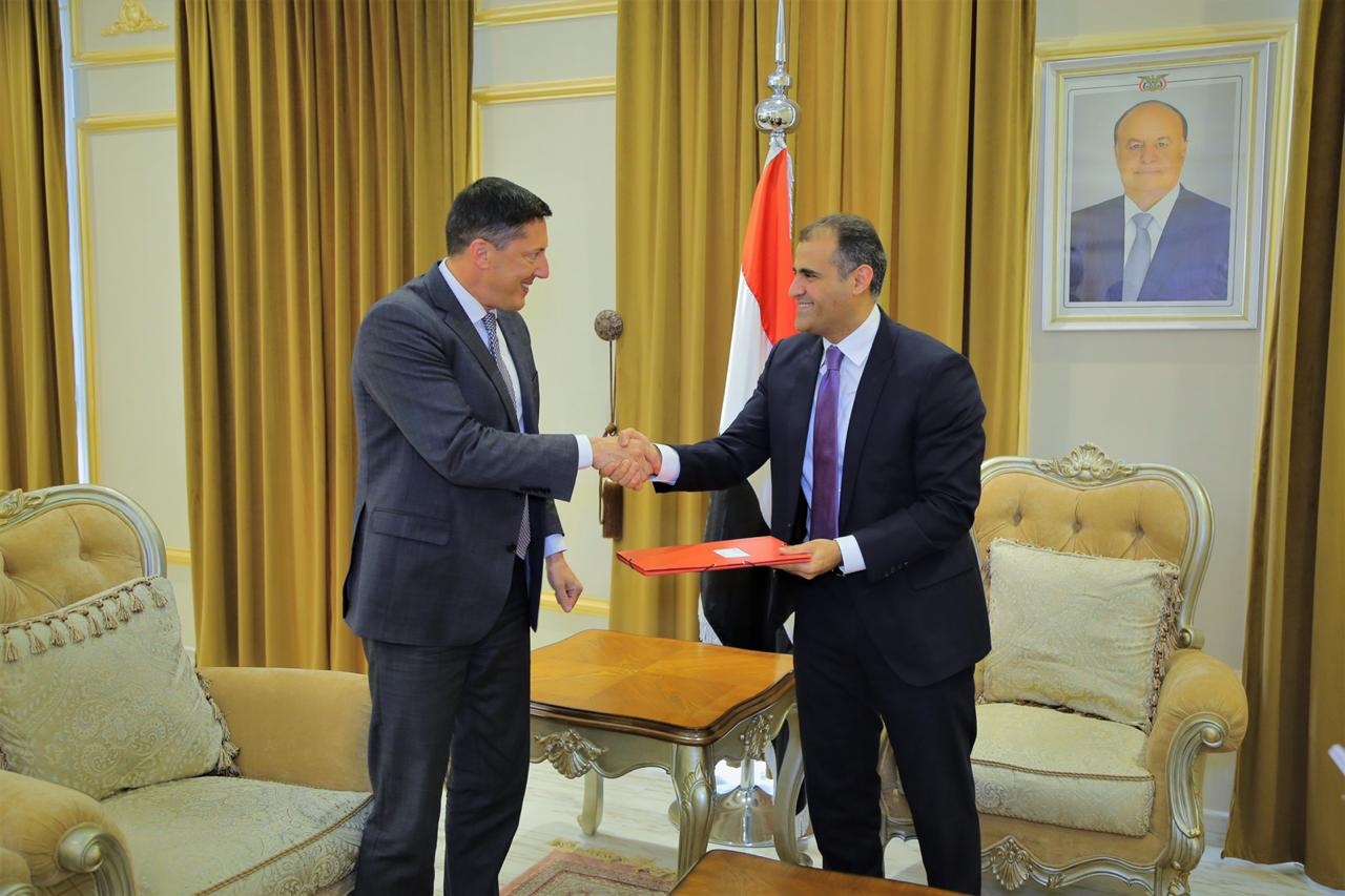 تسلم وزير الخارجية محمد الحضرمي اليوم نسخة من أوراق اعتماد سفير الاتحاد السويسري غير المقيم لدى اليمن بالز اببلانالب.