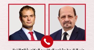 وزير الخارجية يبحث مع وزير الدولة البريطاني نتائج جهود خفض التصعيد في المحافظات الشرقية عدن تلقى وزير الخارجية وشؤون المغتربين الدكتور شائع الزنداني اليوم الاثنين، اتصالا هاتفيا من وزير الدولة البريطاني لشؤون الشرق الأوسط هاميش فالكونر، جرى خلاله بحث مستجدات الأوضاع المحلية، وفي المقدمة التطورات الأخيرة بمحافظتي حضرموت والمهرة. ووضع …