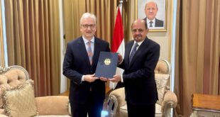 تسلّم معالي الدكتور شائع محسن الزنداني، وزير الخارجية وشؤون المغتربين، اليوم، نسخة من أوراق اعتماد سعادة السفير توماس فريدريش شنايدر، كسفير فوق العادة ومفوض لجمهورية ألمانيا الاتحادية لدى بلادنا. ورحب معالي الوزير بالسفير الألماني، متمنياً له التوفيق في أداء مهامه، وأكد على استعداد الوزارة لتقديم كافة التسهيلات والدعم اللازم لإنجاح …